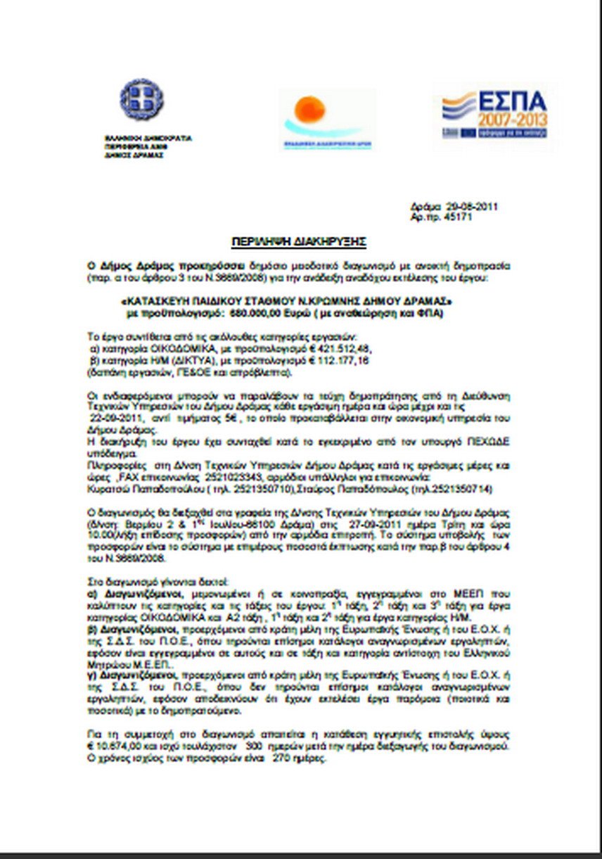 Ν.3669/2008) για την ανάδειξη α ναδόχου εκτέλεσης του έργου:«ΚΑΤΑΣΚΕΥΗ ΠΑΙΔΙΚΟΥ ΣΤΑΘΜΟΥ Ν.ΚΡΩΜΝΗΣ ΔΗΜΟΥ ΔΡΑΜΑΣ»