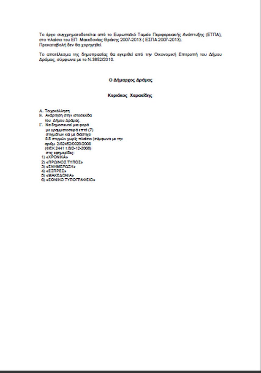 Ο Δήμος Δράμας προκηρύσσει δημόσιο μειοδοτικό διαγωνισμό με ανοικτή δημοπρασία (παρ. α του άρθρου 3 του ...
